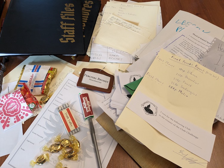 I tried to treat the staff room like an actual staffroom. I used my files to ask them to find a specific student and have a specific word with them, and it seems that worked out well in making the entire college seem like a real college. (OK, some of the prompts were “Can you see if the Rosenblooms are in fact demonologists?” – so not quite a real school.)